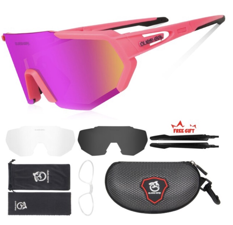pink frame with three interchangeable lenses for all weather conditions